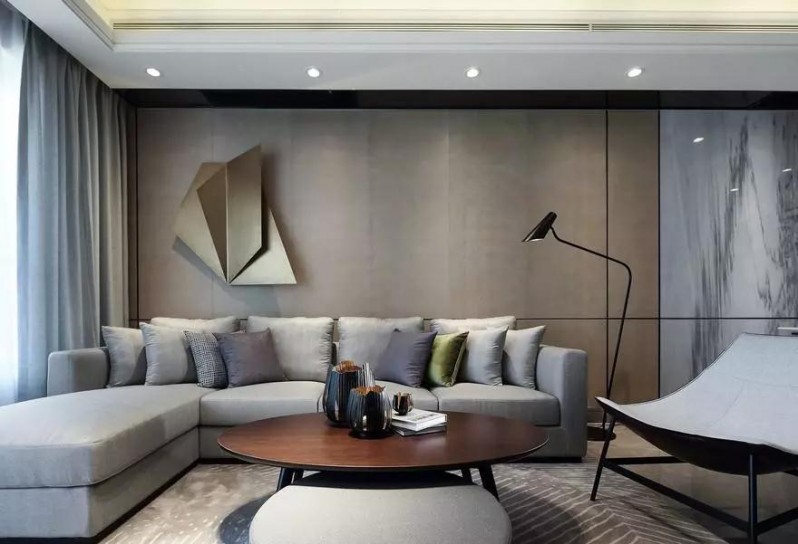 客廳沙發(fā)區(qū)使用灰色的布藝沙發(fā),旁邊放置了黑色的落地?zé)簦瑢⑸嘲l(fā)角落變成一個適合閱讀的空間,也整體上呈現(xiàn)出一種低調(diào)的奢華感。