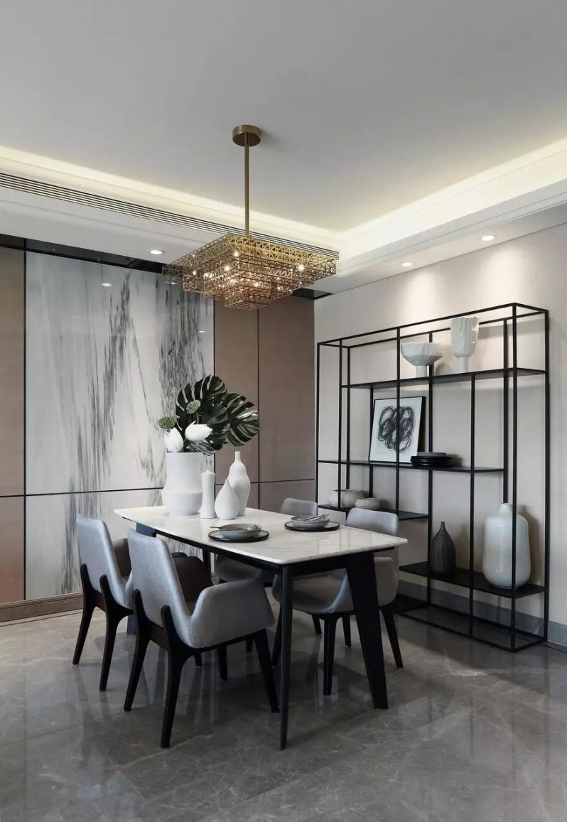 餐廳更加突出黑白搭配的優(yōu)雅,靠墻放置的金屬擱物架,餐桌和餐椅的支撐部分均為黑色,而餐桌的臺面、包括墻壁以及裝飾作用的大理石面板,則是對比強烈的白色。