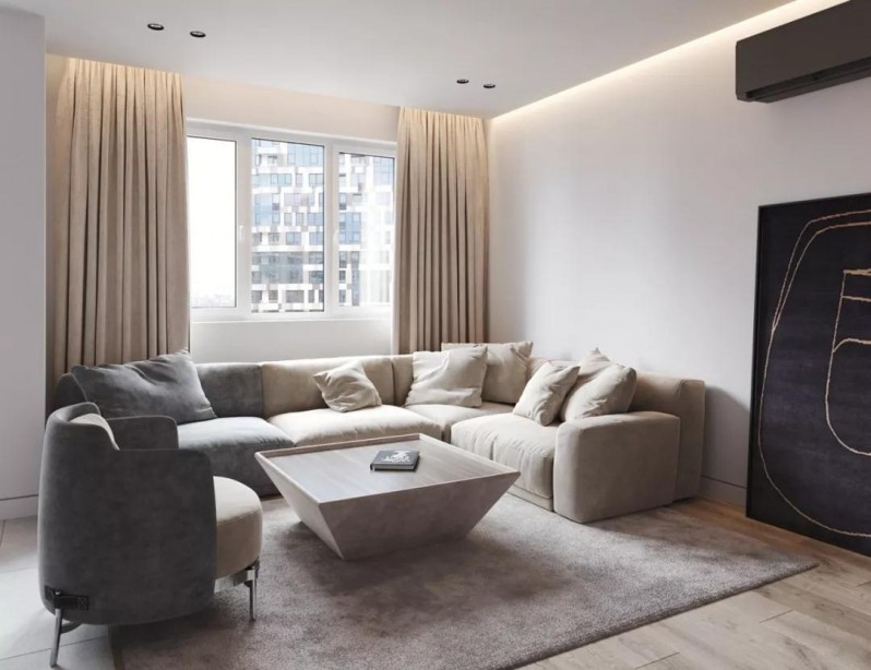 客廳空間緊湊,電視墻非常整潔,電視機直接掛在裝飾板上;使用L型的組合沙發,還有一張單椅;與之搭配的正方形茶幾剛好被沙發所包圍。