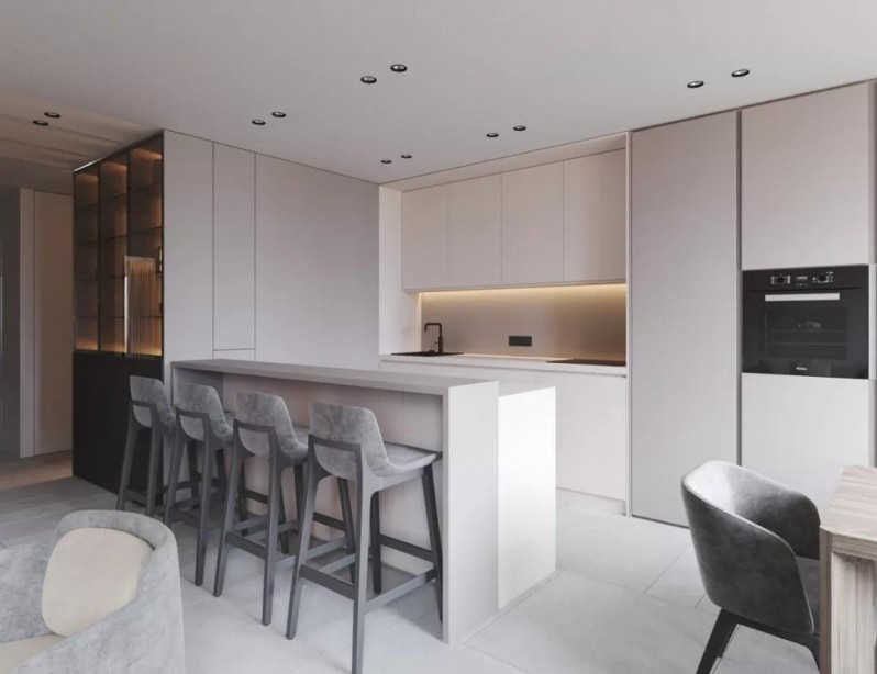 廚房和廚房島使用一樣的材料和色彩,一體感很強;油煙機直接隱藏在吊柜內。