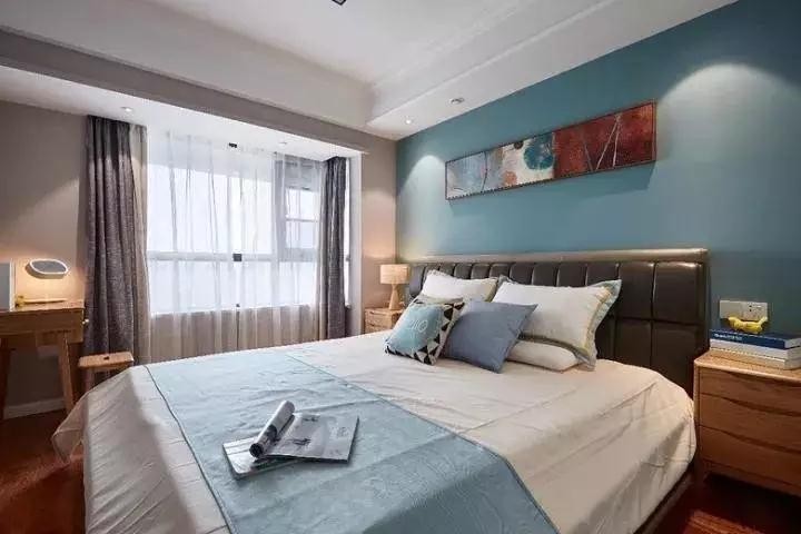 藍色背景墻拋棄了小清新調(diào),更顯成穩(wěn)低調(diào),深灰色軟靠搭配白色床品,輕奢格調(diào)滿滿,讓人不由得想象出一幅畫:精致慵懶的貴族公子坐在床上,翻看著手中的書籍或者嘴里叼一根煙,吞云吐霧,制造絲絲“仙氣”。兩邊的床頭柜是淺木色,斑駁的紋理,更顯原始味,也讓整個主臥更加舒適,充滿暖意。