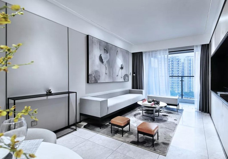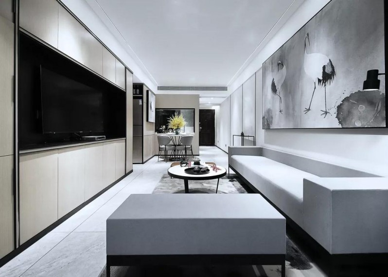 沙發背景墻的裝飾畫,黑白灰色調的仙鶴裝飾畫,與潑墨地毯有呼應的效果,是中式元素的現代化。