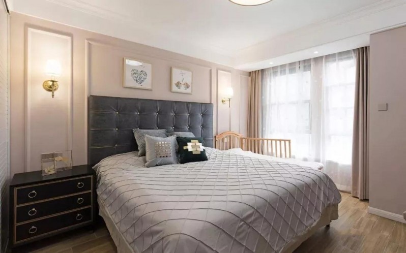 主臥床背景與客廳背景相呼應,搭配皮質軟包大床,制造輕奢美式的質感與格調。