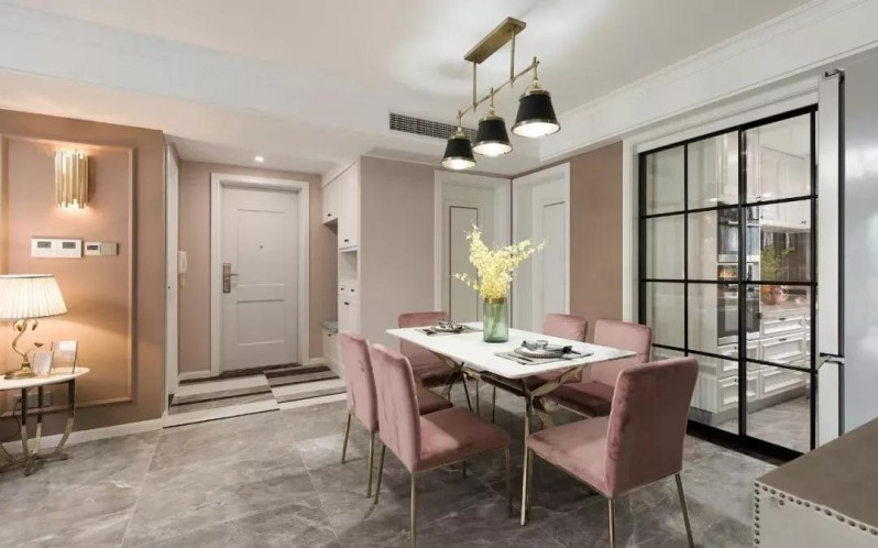 餐廳與廚房相鄰,窄邊黑框玻璃推拉門隔絕油煙的同時,不影響通透性與采光。中花白大理石餐桌搭配粉色天鵝絨餐椅,高端大氣上檔次!
