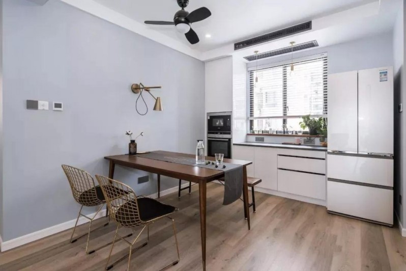 有些人家的廚房太小,實在擠出位置放冰箱,會選擇把冰箱放餐廳。餐廳面積寬敞,在窗邊設置一個西廚區,冰箱、微波爐、烤箱都放這,使用方便。