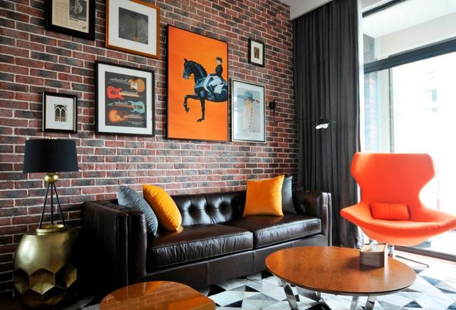 吊頂?shù)暮谏踯壣錈舸钆淝煽肆ιべ|(zhì)沙發(fā),簡約中又帶了一絲粗獷,同時橙色的抱枕和橙色的單人椅相呼應(yīng),讓整體空間不會太壓抑。