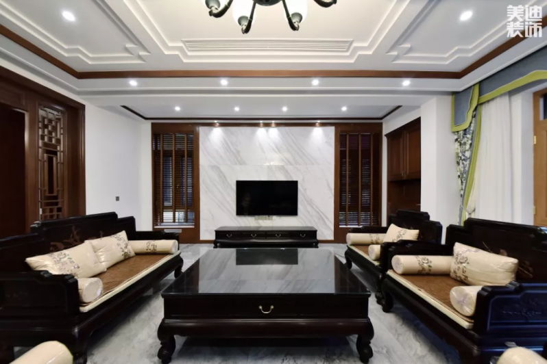 客廳布置采用獨具特色的明式家具,是中式風格中簡約的代表。血檀家具配上淺色大理石地板和電視背景墻,深淺對比,剛柔并濟。