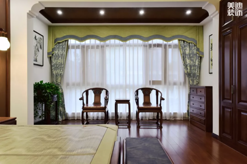 明式家具也在臥室中充分綻放出它的魅力,原木色家具配上亮色窗簾和綠植,空間沉穩中又不失靈氣,更彰顯出原木色的高貴與優雅。