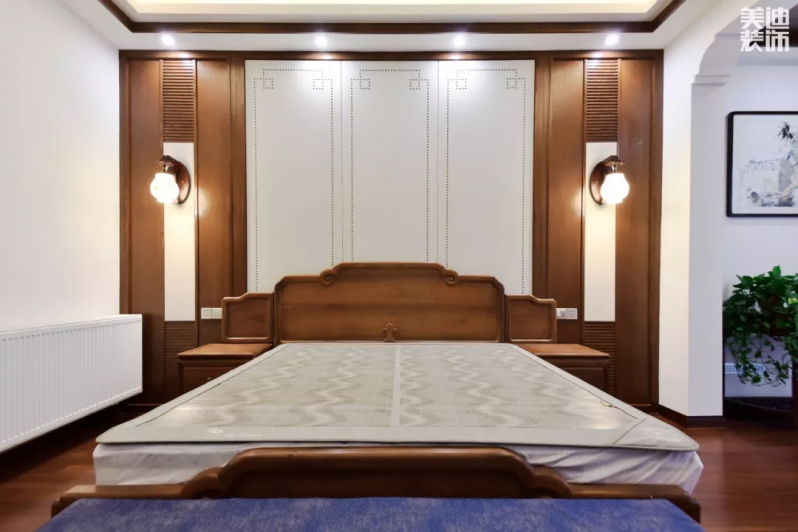 主臥的設計也延用原木色和中國風回紋設計,床頭背景同樣是深淺色對此,但這給人更多的是恬靜溫馨之感。