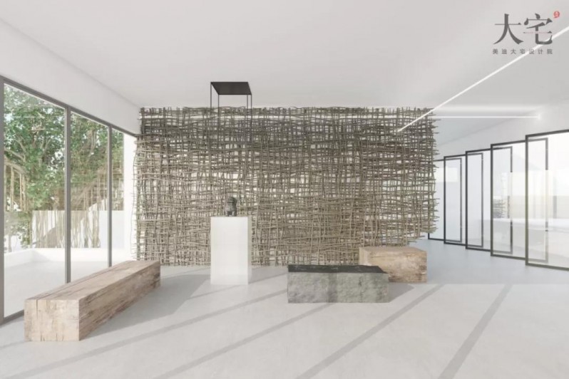 設計說明:本案位于廣西河池市懷遠鎮,業主出生于70年代中期,熱愛戲曲,希望將此空間做為國學會所,感受中華傳統文化的熏陶。踏勘初期我們發現建筑外圍有一顆古榕樹,周圍有非常多的樹藤,獨木成林,我們希望將這種元素延展到建筑內,在建筑主體內一半以上的空間都能夠看到它,感受透過古樹灑進來的光影。
