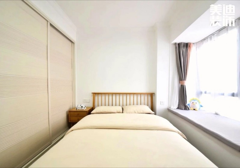 次臥采用同樣簡潔自然的北歐風,松軟舒適的家居,原木色的衣柜與整體風格搭配統一。