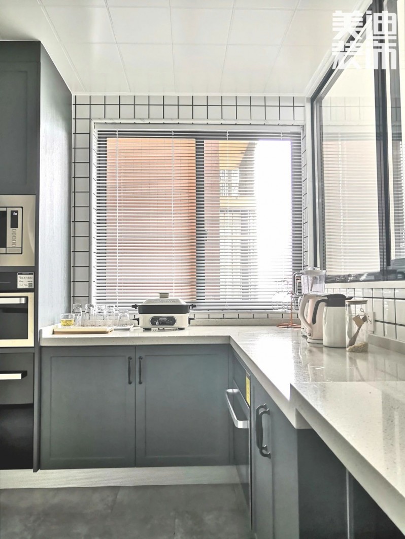 原本廚房的戶型較小,所以龔廣輝設計師把原來餐廳的空間擴充到廚房,改造后整個空間利用率提高,櫥柜操作臺面更充裕。