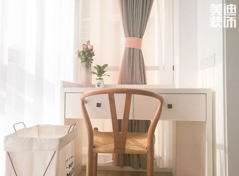 主臥被一片粉色占領,感覺來到女生夢寐以求的“魔法城堡”。床對面是一整面內嵌的壁柜,解決了小敏的收納問題。