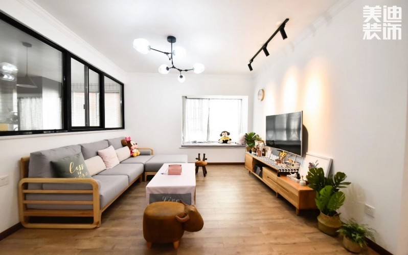客廳和廚房之間,裝了一扇黑框玻璃窗戶,與電視背景大白墻相呼應,視覺上空間有放大的通透效果。飄窗的光線照進客廳,顯得格外寬敞明亮。