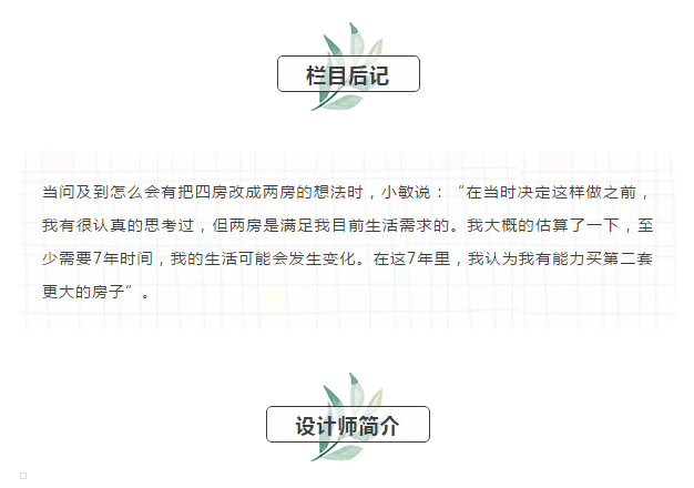 1.本案戶型原來是四房,通過了解到小敏未來的家庭成員結構,龔廣輝設計師只保留了兩房。依照過去的居住習慣讓小敏明白,多出來的房間最后只會淪為雜物房,所以沒必要為了遷就少數不確定因素而屈就自己的日常生活。