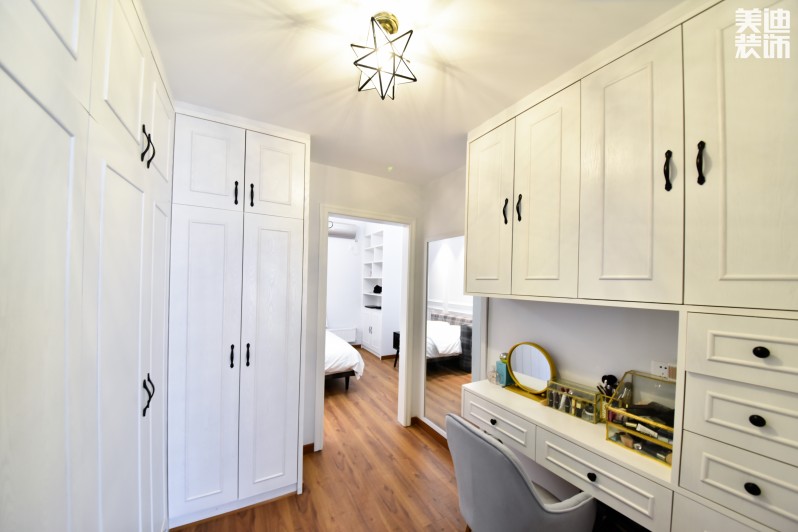 2.高旸設計師考慮到女主人的需求,把臥室衣帽間向外“挪”了一下,梳妝臺設計到衣帽間的區域,臥室看起來就更寬敞明亮。
