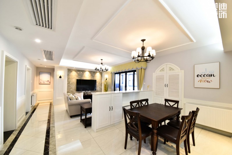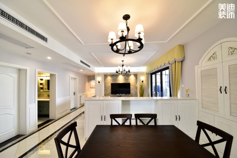 為了能和外部空間有互動,設計師高旸在餐廳窗洞的位置做了歐式風獨特造型,既保留了窗戶功能,又有著濃濃的簡歐風情。