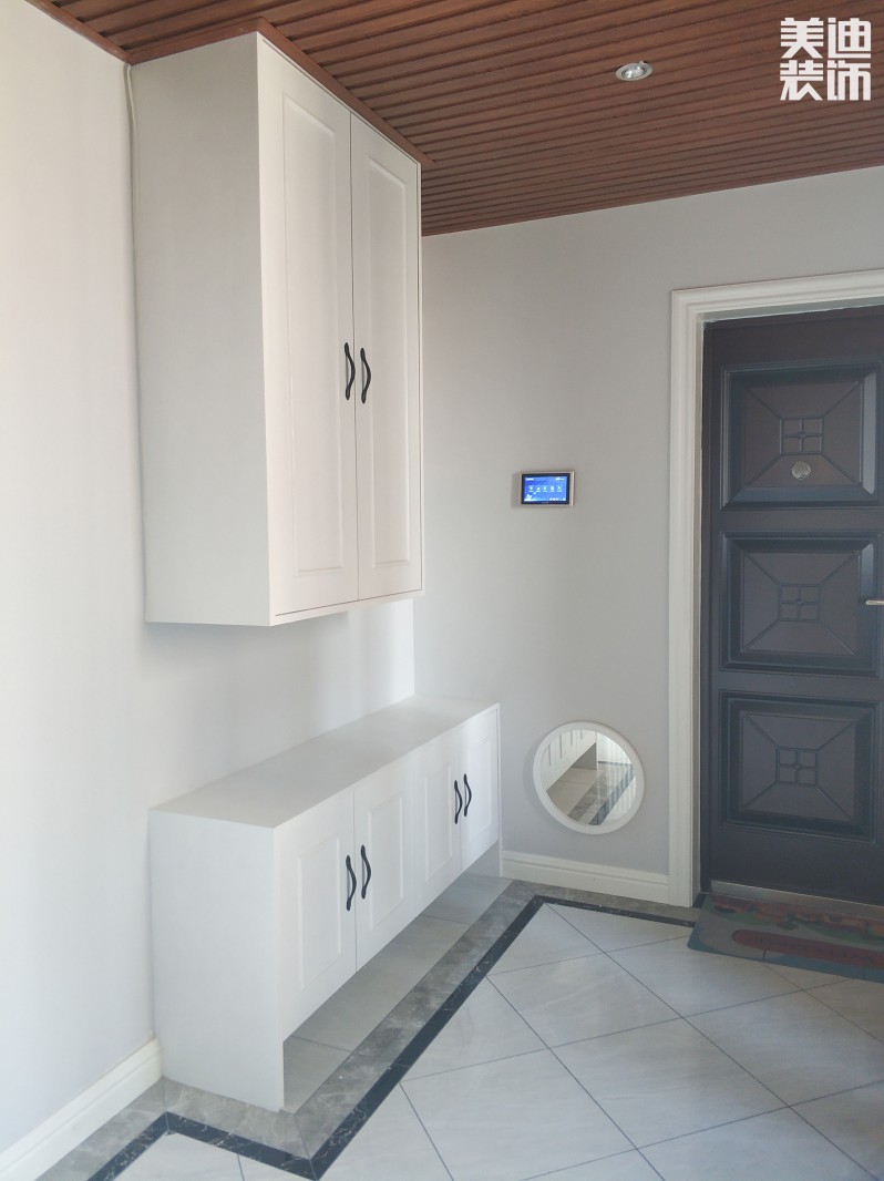 進門玄關設計很簡單,一側的白色柜子能容納衣服、鞋子和包包,也可以放一些出門隨手物品。