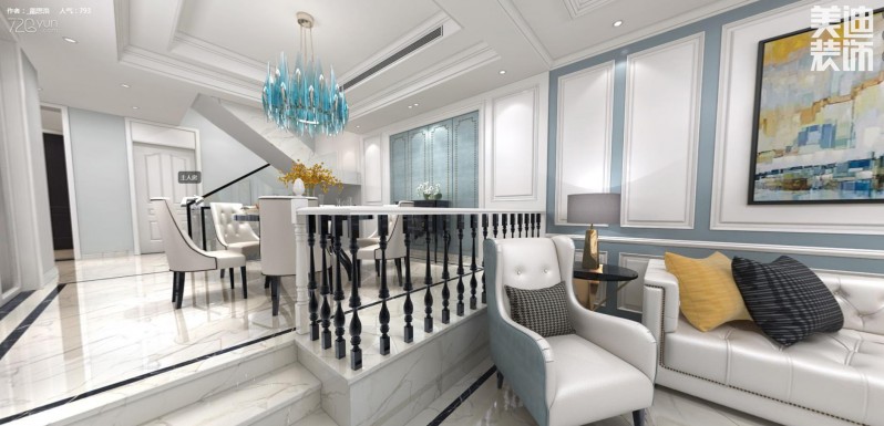 一個冰冷自傲,一個自帶溫暖,兩者關系相輔相成,不僅展現了一種引領潮流的設計格調,更是品質生活方式的藝術呈現。在龍思洛設計師這套作品中,夸張的抱枕圖案搭配淺藍色水晶燈,讓人感到沒有任何束縛。