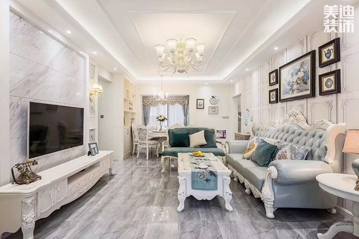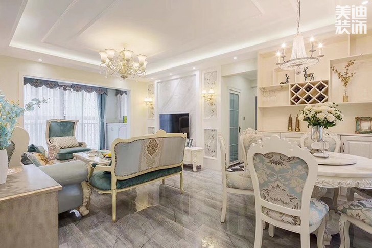 在這套案例中伍錫雷設計師采用淺色為主,深色為輔的設計,整體的白色加上一些的淺藍,在簡約優雅的歐式風格中融合得恰到好處。而客廳用淺藍色窗簾、歐式壁畫、復古座式電話機來做點綴,將歐式的浪漫風情展現的淋漓盡致。
