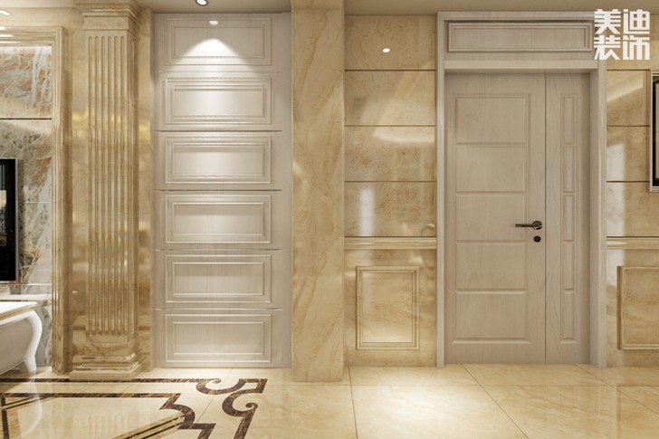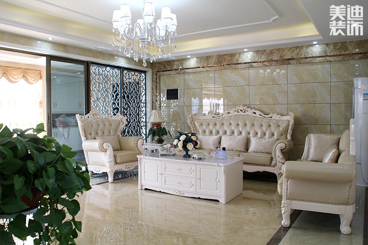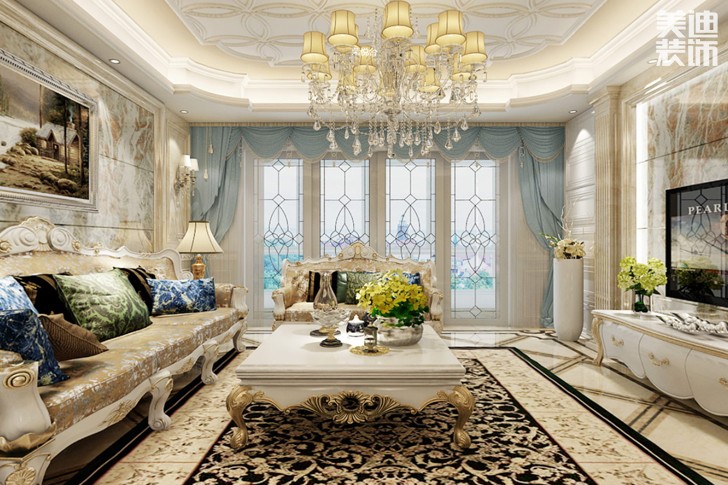 高敏設計師打破傳統歐式色調的原則,大量運用白色、米色等淺色調設計,加上少量的藍色、棕色、黃色相互碰撞使整體顏色十分飽滿。同時瓷磚上墻設計、歐式風情的壁畫、大氣流暢的吊頂,使得整個空間的映襯對比都顯得相得益彰。