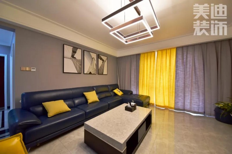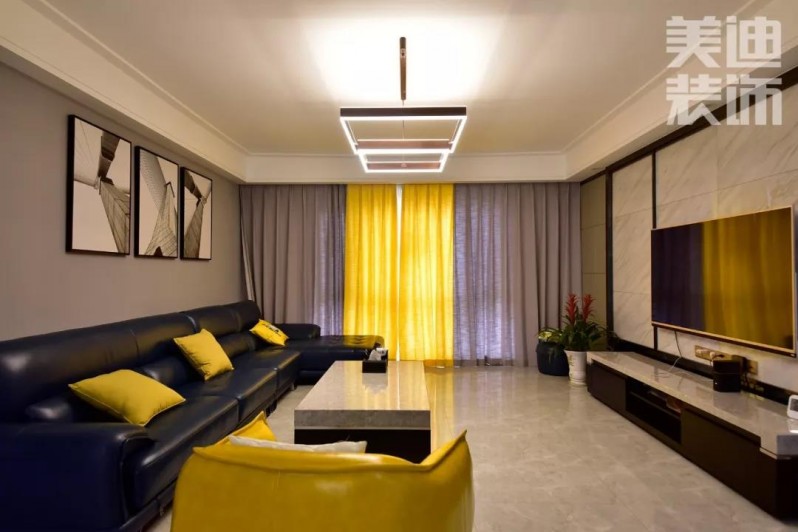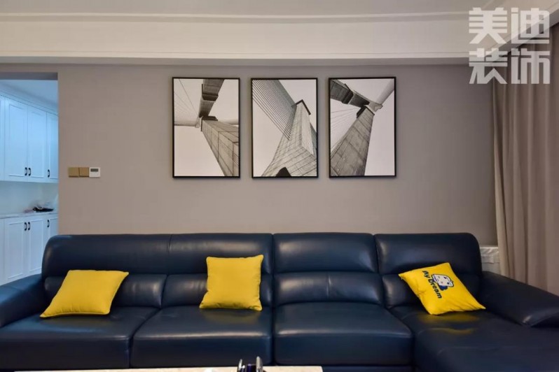 整個(gè)空間調(diào)性以灰色為主,凸顯空間質(zhì)感,沉靜的深藍(lán)色皮質(zhì)沙發(fā)與活潑黃色調(diào)的枕頭點(diǎn)綴使空間亮了起來(lái)。