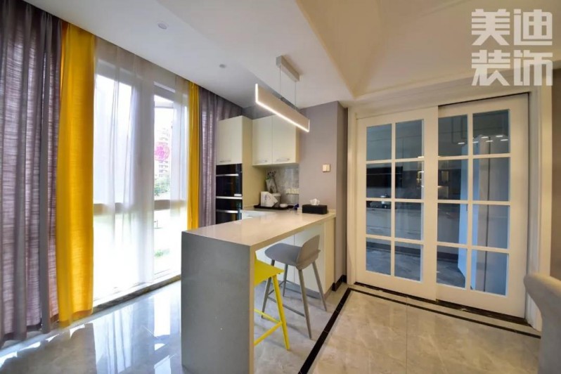 房主楊姐特別喜歡研究菜品,經(jīng)常在家做西點(diǎn),追求精致的生活。設(shè)計(jì)師在設(shè)計(jì)中盡可能減少隔墻,弱化視覺(jué)阻礙的同時(shí)放大空間的通透性,從而使整體空間氛圍更加簡(jiǎn)潔典雅。在色彩方面,采用對(duì)比色相搭配法,體現(xiàn)出空間的視覺(jué)焦點(diǎn),彰顯活力。