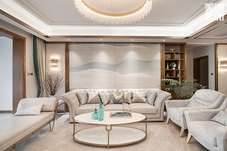 吊頂無論使用何種材料,要比地板和墻壁的顏色淺,否則會給人一種頭重腳輕的壓迫感,久住的話會讓家人精神壓抑。裝飾客廳設計吊頂時,可以根據“天清地濁”的原理來考慮。