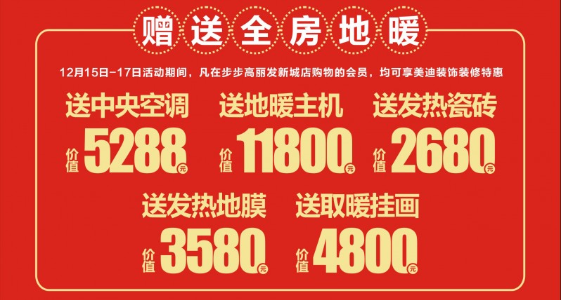 來美迪裝飾定裝修還送全房地暖:中央空調、地暖主機、發熱瓷磚、發熱地板、取暖掛畫,每戶立省2-8萬元,全年度優惠力度最大。