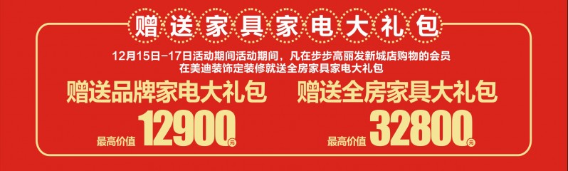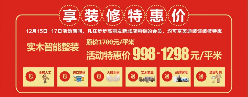 活動期間(12月15日-17日),凡在步步高麗發新城店購物的會員,均可享美迪裝飾裝修特惠價998-1298元/平米,并且承包你家的全房人工、全房燈具、進口基材、大牌主材。