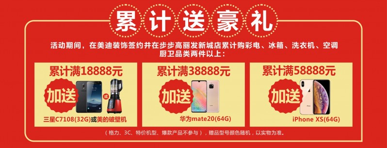 活動期間(12月15日-17日),在美迪裝飾簽約并在步步高麗發新城店累計滿18888元加送三星手機或美的破壁機,累計滿38888元加送華為mate20(是64G的哦~),累計滿58888元加送iphone XS!!!