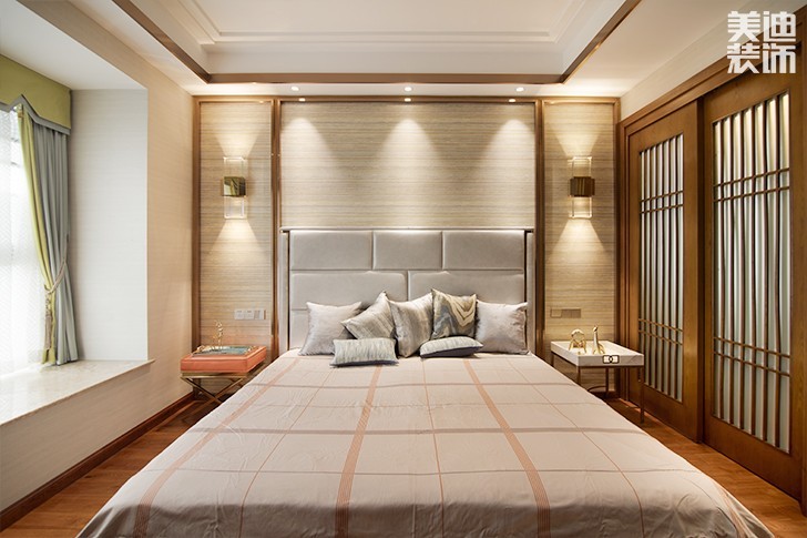 主臥的設計主要集中在床頭背景墻那塊,設計師采用了淺藍色的條紋,給臥室增加光彩,落地窗的設計直通陽臺。
