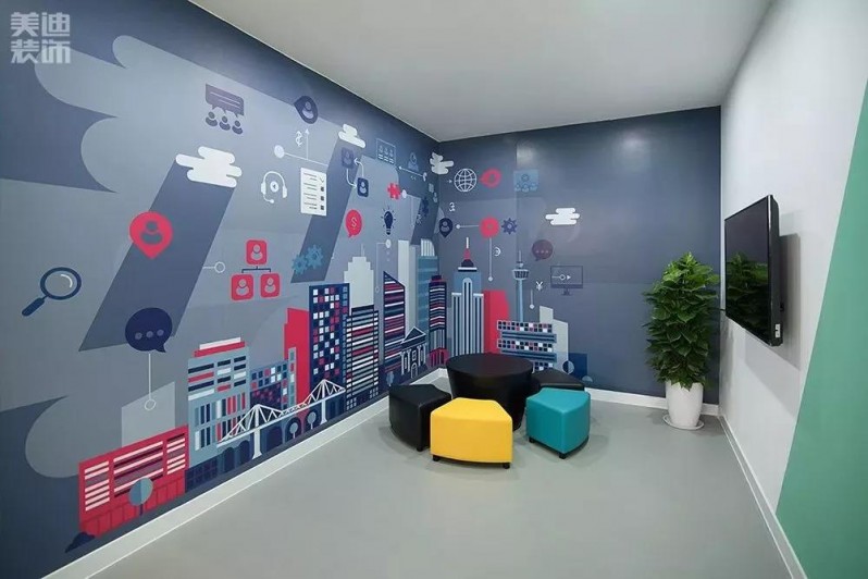 休閑區(qū)的設(shè)計富有趣味,彩繪的墻面、綠植帶來好的心情,給帶小孩的顧客提供玩樂空間。
