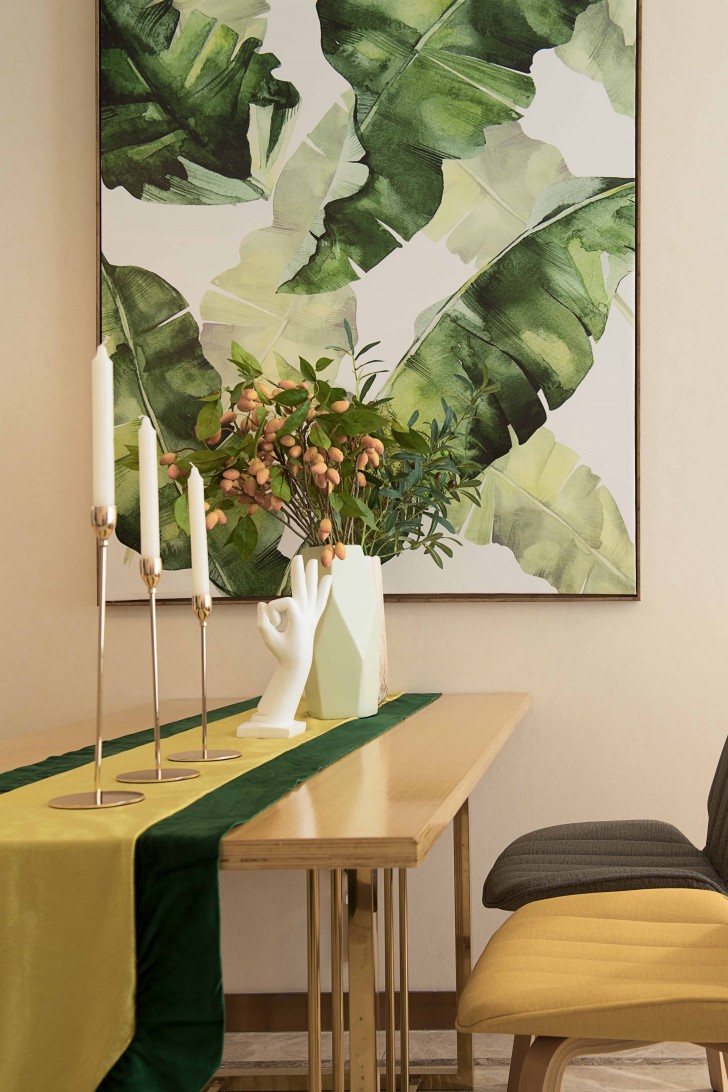 餐廳餐桌椅以深木色木質餐桌和淺綠色皮質餐椅組成,餐廳背景墻作淺綠色硬包設計,掛和那個一組美式風情裝飾畫,加上桌面和地面的花朵綠植,格外讓人陶醉。