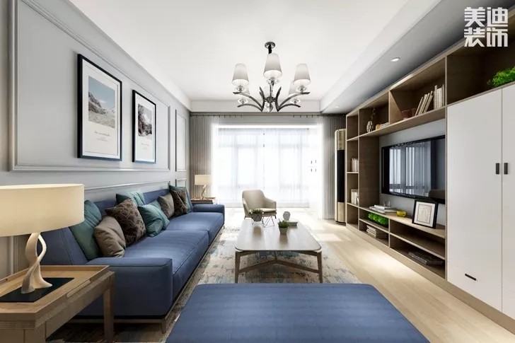 或留出幾個開放式展示柜,將相框、裝飾品、書籍擺放其中,讓客廳多了一份精致感,空間看起來也更加完整了。