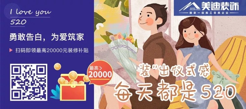 美迪裝飾新品發布鉅惠季暨“520為愛筑家 ”雙重鉅惠,定制整裝原價1298元/平米,活動價僅需998元/平米,每戶還可領取2000-20000元裝修補貼。