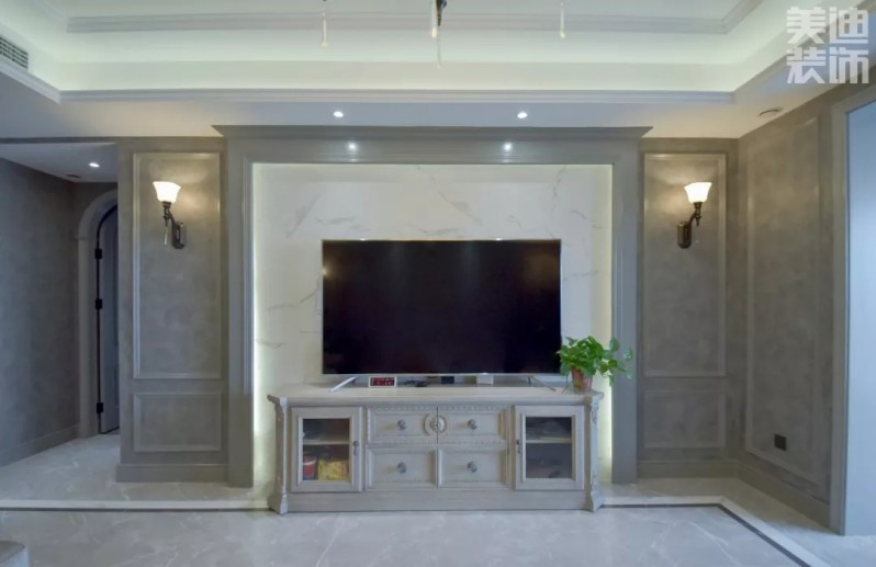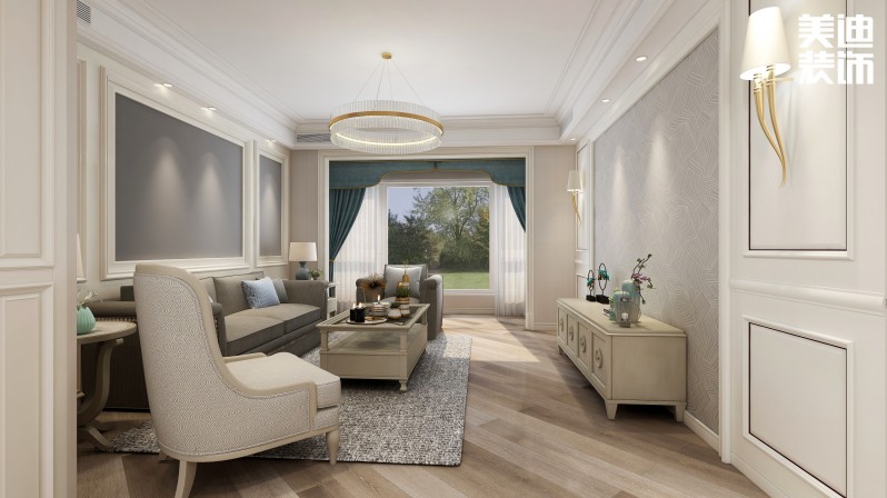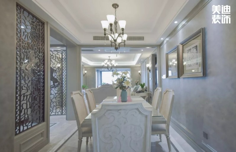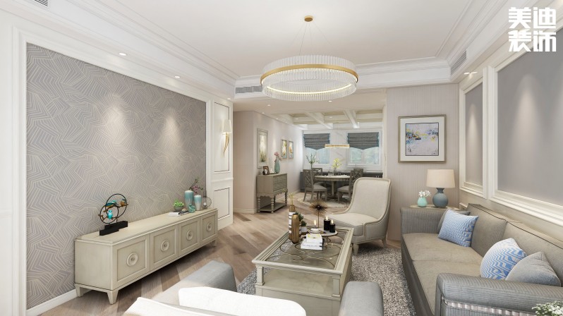白色、灰藍(lán)色背景墻的簡(jiǎn)約柔和與淺灰色家具相得益彰,產(chǎn)生恰到好處的舒適度,龍思洛設(shè)計(jì)師在色彩搭配上極其巧妙,灰藍(lán)系適中的色彩調(diào)性散發(fā)優(yōu)雅酷感的空間氣質(zhì),再加水晶吊燈渲染,盡顯奢華。