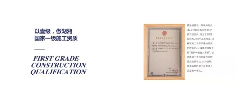 美迪裝飾擁有國家一級施工資質的裝飾企業,追求高質量工藝,對待每一個工地都做到“防滲漏、防開裂、防干擾、防污染”,獲得“全國無甲醛環保裝修示范單位”、“中國家裝行業二十年設計機構十強企業”“湖南十佳樣板工地企業”等榮譽稱號。