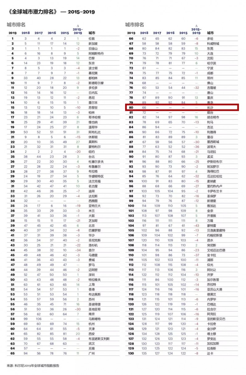 根據榜單,一線城市的座次從去年的“上北深廣”重歸“北上廣深”。2019年,15座新一線城市依次為成都、杭州、重慶、武漢、西安、蘇州、天津、南京、長沙、鄭州、東莞、青島、沈陽、寧波、昆明。前四名城市排名相對穩定,長沙排名較去年上升一位。