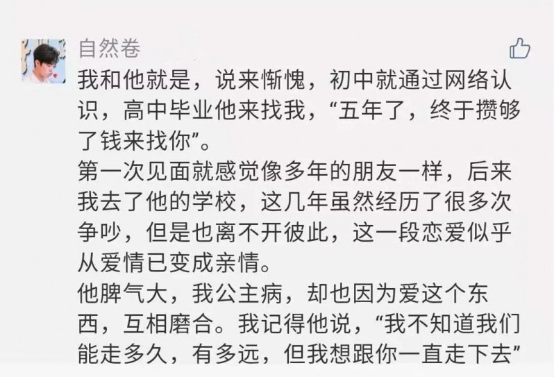 但作為一個才開始戀愛關系不久的女朋友,她能夠每天不離不棄守在我身邊,我感覺這輩子就她了,不離不棄,一輩子會對她好,這份逆境中守護最是難得可貴。