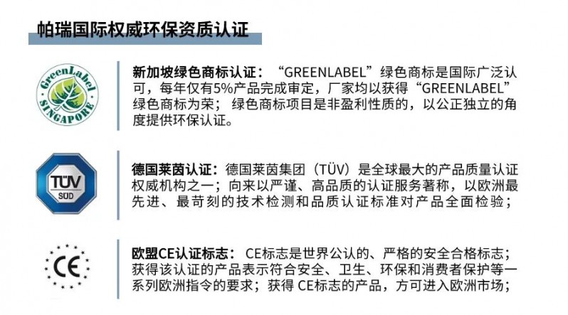 帕瑞涂料在VOC含量相關(guān)檢測(cè)中VOC含量趨0,重金屬物質(zhì)檢測(cè)中無(wú)汞、鉛等物質(zhì),符合國(guó)內(nèi)外各類檢驗(yàn)標(biāo)準(zhǔn),并取得國(guó)際多項(xiàng)權(quán)威資質(zhì)認(rèn)證。