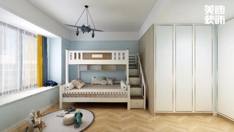 對于小戶型家庭來說,還要解決問題是如何合理分配空間,除了特定的睡眠區域,同時騰出更多空間定制衣柜和書桌區,滿足孩子收納學習需求。