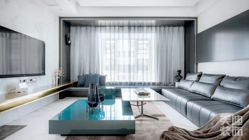 采用高低組合式的大理石茶幾,視覺上形成落差,藍(lán)色與白色長方形的錯(cuò)落設(shè)計(jì),滿足不同的多樣化需求,同時(shí)更與沙發(fā)形體相呼應(yīng),整體結(jié)構(gòu)呈現(xiàn)出一種工整、理性的直線感、層次分明。