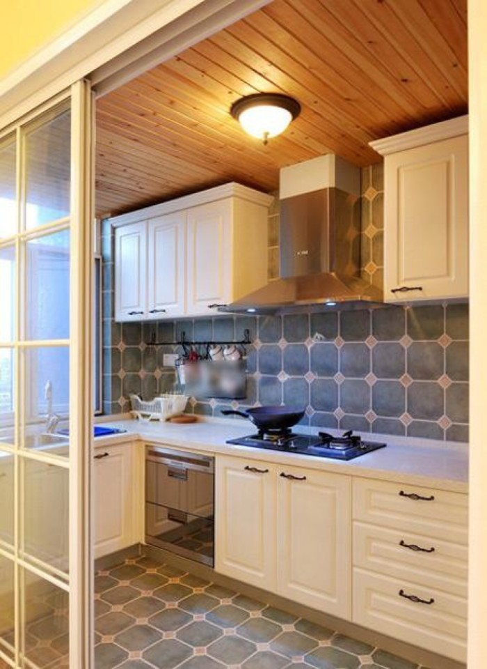 廚房選用的燈具通常以防水、防油煙和易清潔為原則。一般在操作臺的上方設置嵌入式平板燈,嵌入材質以鋁材,這樣頂棚簡潔,減少灰塵、油污帶來的麻煩。灶臺上方一般設置抽油煙機,機罩內有隱形小白熾燈,供灶臺照明。若廚房兼作餐廳,可在餐桌上方設置單罩單火升降式或單層多叉式吊燈。光源宜采用暖色白熾燈,不宜用冷色熒光燈。
