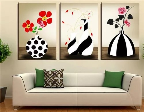 如果您不想采用太過復雜的裝飾畫,不妨來一點小清新的,客廳背景墻上懸掛三幅以花瓶、鮮花為主題的裝飾畫,配上白色簡約款的沙發,將客廳裝扮的格外的清新、淡雅,別有一番滋味。