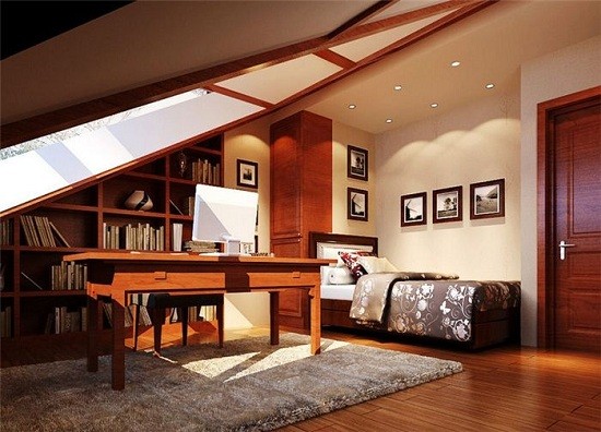 閣樓是整個家居裝修設計一個較特殊的室內空間,通常情況下的閣樓具有低矮和不規則等特點,所以,在設計過程中需要通盤考慮,比如樓梯口不要設計在斜頂下,墻與地板交界的三角區域,可以放上開放式隔架,做成儲物空間等。