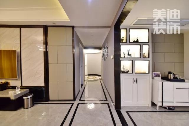 過道盡頭圓形上方的設計顯得特別,在現(xiàn)代風格里夾雜了一點古代歐洲的韻味。右邊是記錄著一家人點滴回憶的照片墻,正對著一個房間的門口。