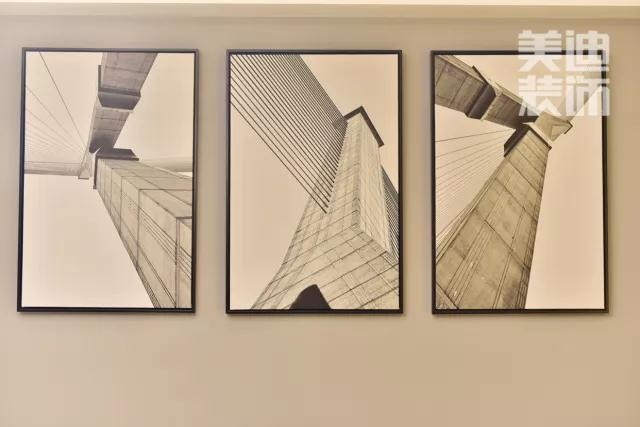 客廳沙發(fā)上的壁畫也是設計師為業(yè)主精心挑選的,建筑的灰白調(diào),以及層次分明的線條感,極大程度上提升了整個空間的格調(diào)。
