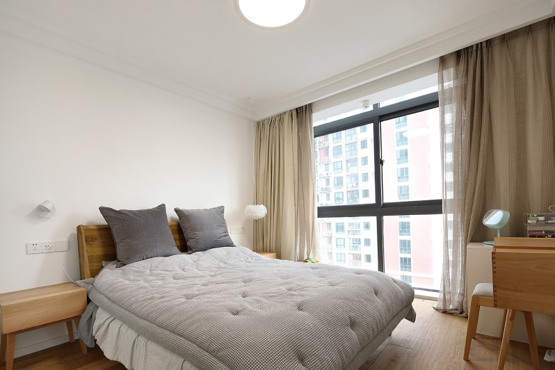 臥室的光線非常好,雙層的布藝窗簾契合了整體色調,讓臥室看上去更多了安靜的感覺。臥室家具的搭配也盡量是用到了原木色,溫馨且清新。
