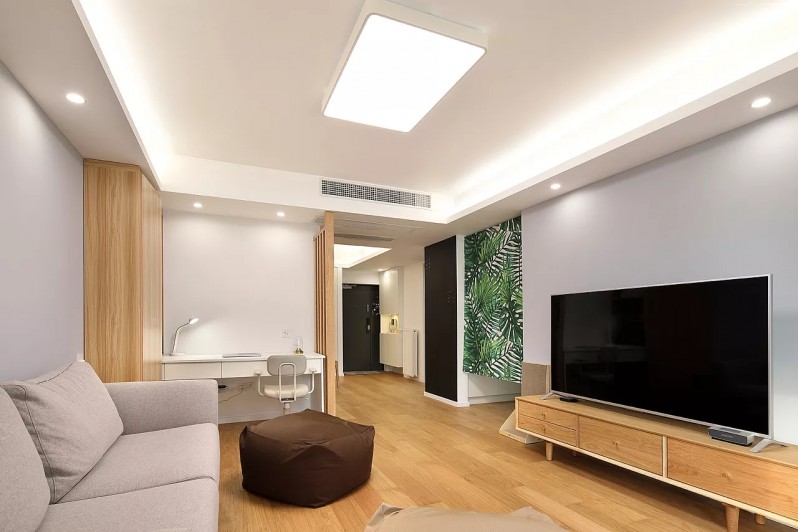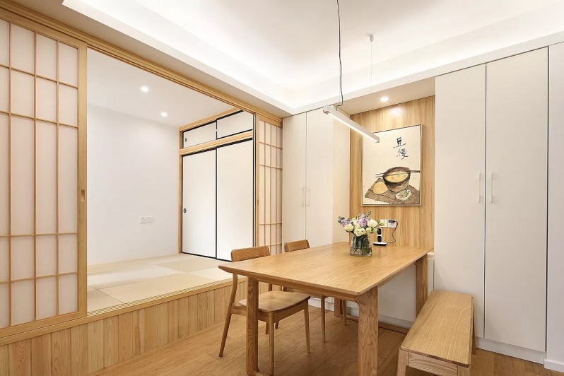 日式裝修風格,以舒適感和清新感為主,這款90平方房子裝修,以原木色為主色調,通過合理的空間調配和協調,房子整體設計簡潔,明快,加上一些裝飾作為搭配,不僅視覺上擴充了空間,同時也營造了一股自然的氛圍。